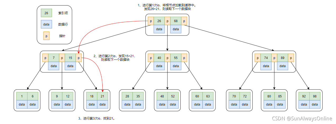 那么,在B树上读取索引项为21的流程是怎样的呢?
