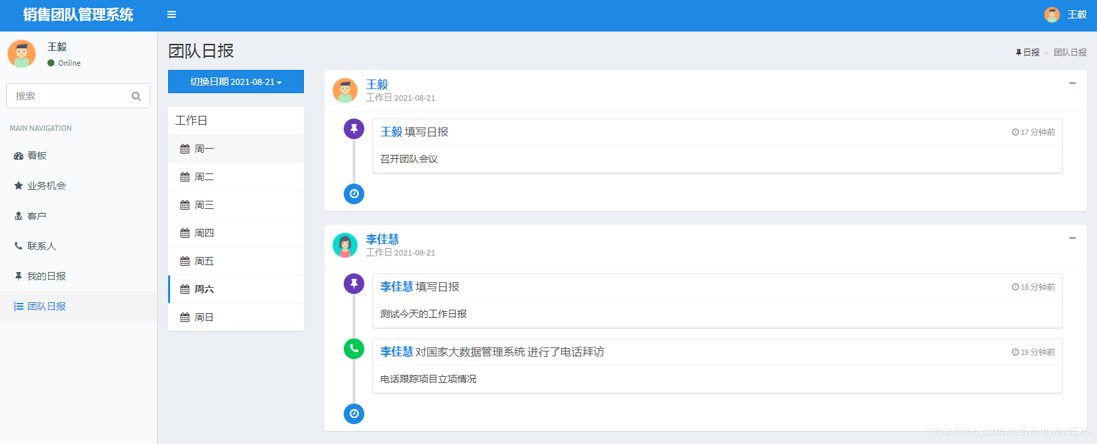 销售主管登陆:除了拥有销售员的基本功能外,主要是查看团队的日报工作进展