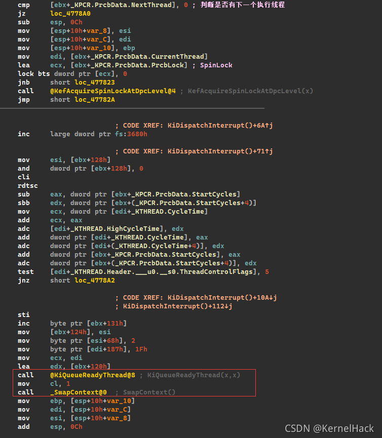 - 有备用线程(KPCR.PrcbData.NextThread) KiDispatchInterrupt SwapContext