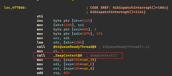 KiDispatchInterrupt最终也会调用SwapContext来切换线程.