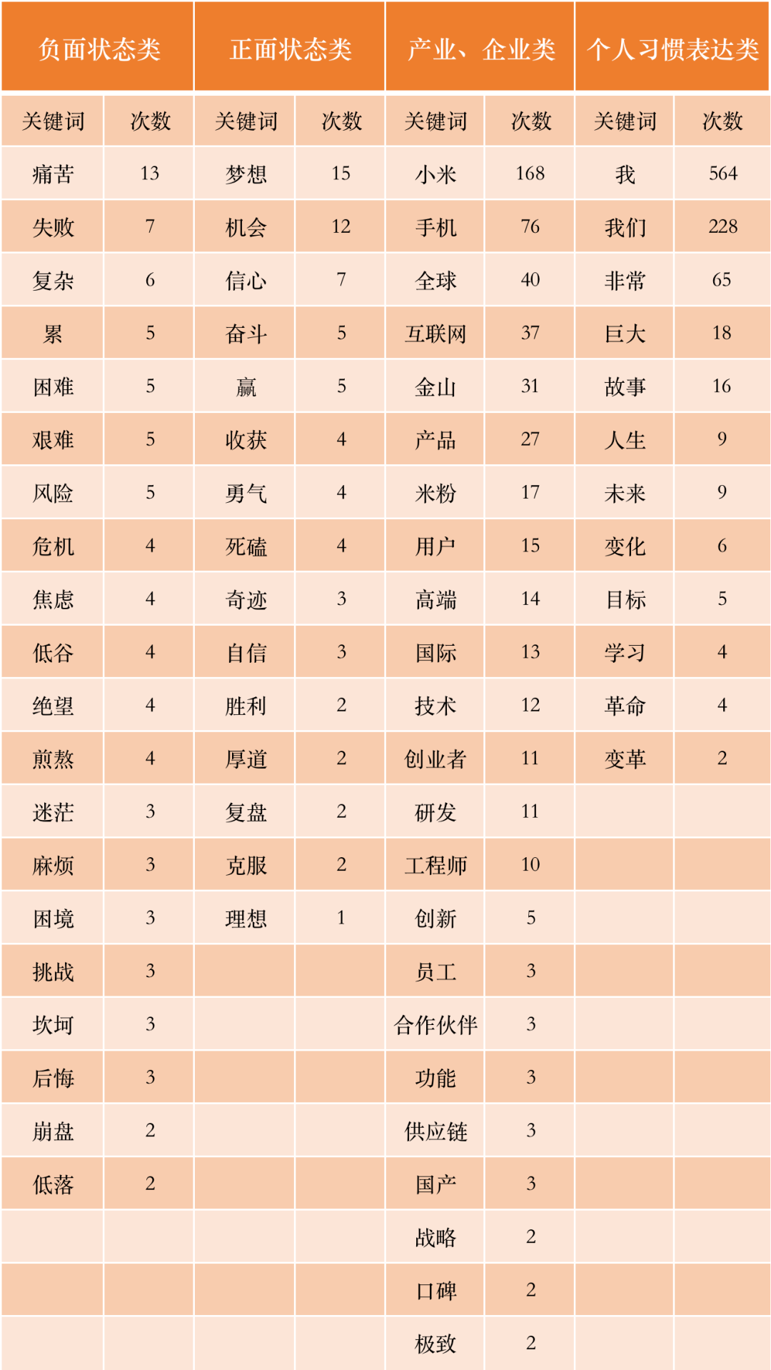 根据《中国企业家》统计,雷军演讲中用到如“痛苦、失败、危机”等负面状态的关键词有20个,共说了90次;而“梦想、机会、成就”等正面类的关键词是15个,共说了71次。此外雷军还喜欢在演讲中用非常、巨大等词语去强调危机和困难。